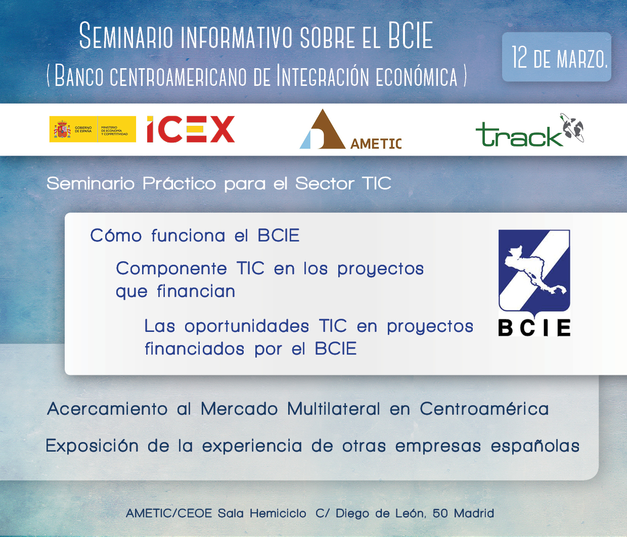 En el seminario, varios ejecutivos claves del BCIE (Banco Centroamericano de Integración Económica), expondrán cómo funciona la institución, cuál es el componente TIC en los proyectos financiados y las oportunidades TIC que se quieren priorizar. Track acercará a los asistentes al mercado multilateral en Centroamérica y coordinará la mesa en la que miembros del BCIE abordarán las Oportunidades TIC en proyectos financiados por el Banco.